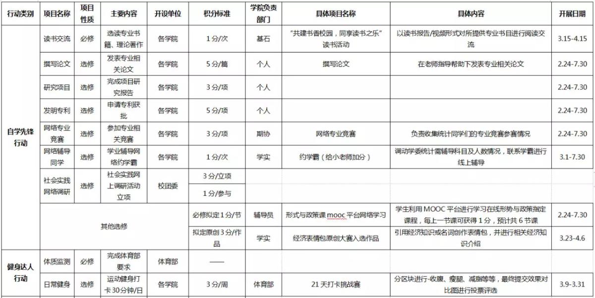 延期开学期间,本行动计划中所涉及的面向本科员工开设的项目,全部通过“学工系统”进行发布,员工可以在校外通过VPN登录进行查阅并选择参加,对于偏远地区或不具备网络条件的员工,其参加的项目可以由班长单独记录,待返校后补录入系统。硕士研究生参加相关项目的积分记录,由研工部统一安排。