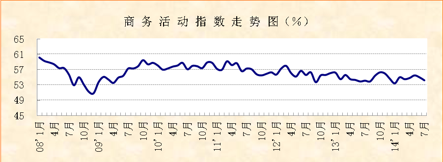 中国物流与采购联合会、国家统计局服务业调查中心发布的2014年7月份商务活动指数较上月回落0.8个百分点,达到54.2%。从各分项指数看,新订单指数与上月持平,新出口订单指数小幅回落,中间投入价格指数和收费价格指数双双回调,业务活动预期指数上升,市场运行保持平稳。