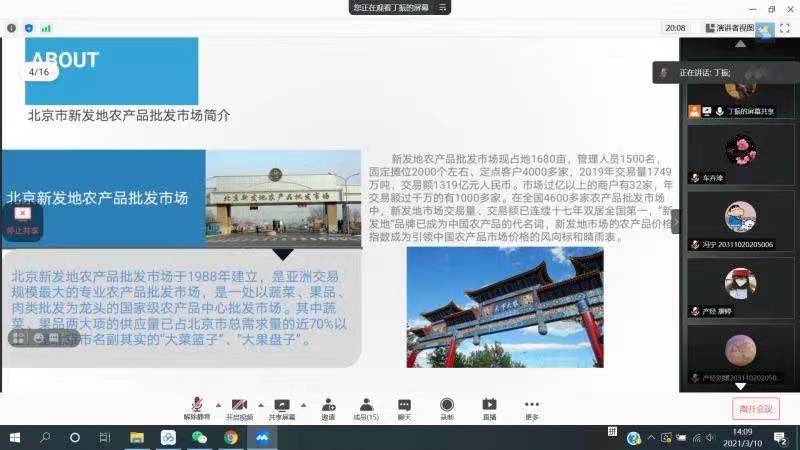 2021年3月10号下午两点,伟德国际bevictor1946第九期“产经学术沙龙”通过线上腾讯会议举行。赵娴教授、车卉淳教授、杨静老师、黄雨婷老师和邹旭鑫老师参加沙龙并进行指导,产业经济学专业全体2020级研究生参加了本次沙龙。本次沙龙重点围绕“后疫情时代面向食品安全需求的北京市农产品批发市场转型升级研究”这一主题展开研讨。