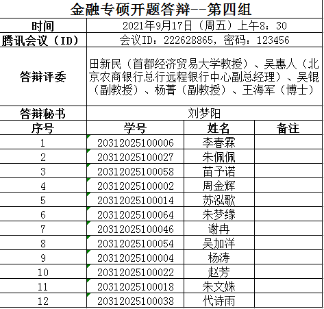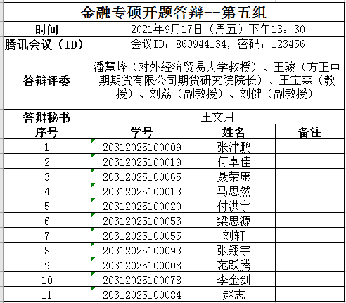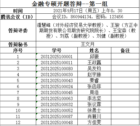 2020级两年制金融硕士研究生开题答辩,需每人提交下列材料到各班级负责人,由负责人汇总后于9月16日(周四)上午9:00前提交至人文楼310郭老师处,提交材料包括: