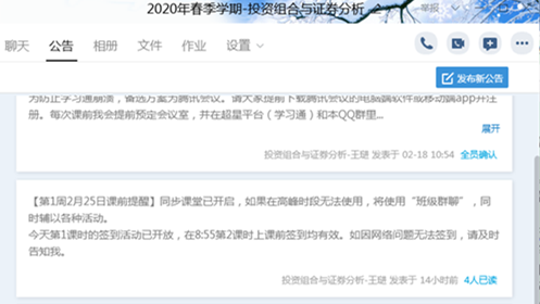 2月25日早晨8:00,伟德国际bevictor1946金融学系讲师王琎本学期承担的研究生必修课《投资组合与证券分析》准时开课,需要指出的是在网络授课高峰期,王琎老师成功地抢占了同步课堂资源,进行了一次理想状态的运用平台推荐的授课方式授课,用学习通与员工们互动交流,而且全程下来,音频没有间断,同步直播一直在线。