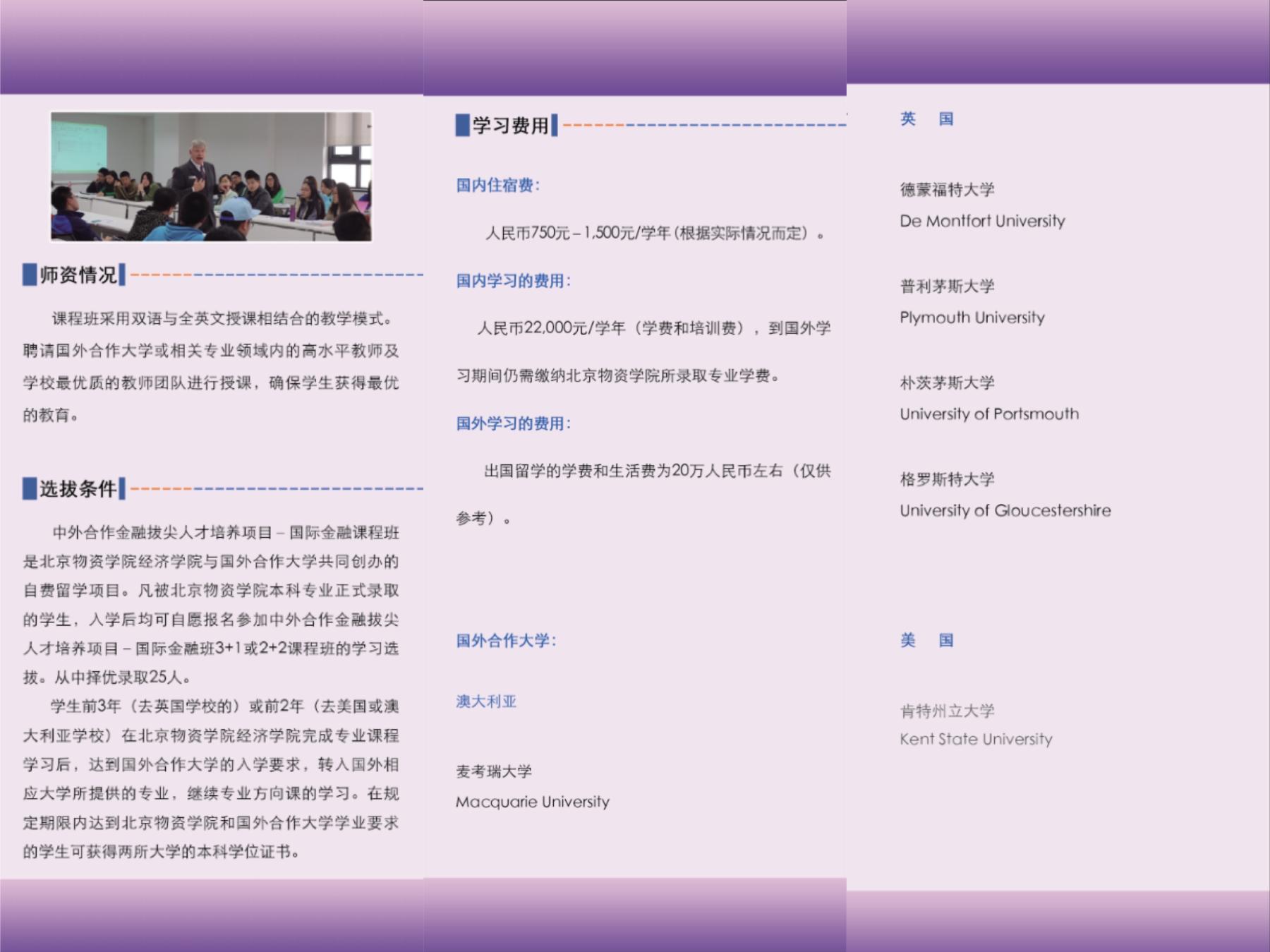 2.课程体系国际化:专业课程设置与国外知名大学商科专业保持一致。采用外语教学:专业课程采取从中英文双语教学逐步实现全英语教学的循序渐进的教学方式。
