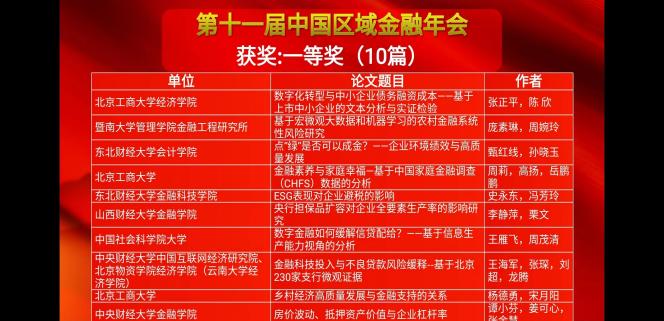 20221022日至23日,第十一届中国区域金融年会在山西财经大学举办。公司2021级研究生员工张琛合作与金融系王海军老师、云南大学伟德国际bevictor1946龙腾博士、北京银行总行刘超老师合作论文荣获年会论文一等奖,张琛同学还代表作者做了论文汇报发言。