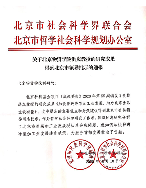 2020年10月10日,洪岚教授在《加快推进净菜加工业发展,助力北京生活垃圾减量》中提出的主要观点和对策建议得到了北京市有关领导同志批示。作为哲学社会科学研究工作者,洪岚同志研究分析了北京市净菜加工业发展现状及存在问题,就如何加快推进净菜加工业发展建言献策,为服务首都发展做出了贡献。