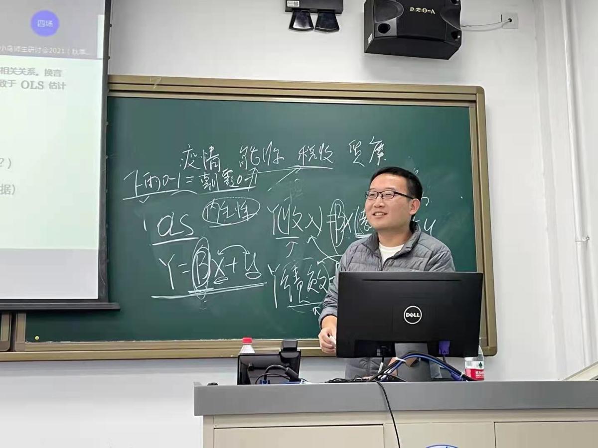 2021年11月9日下午14:00,伟德国际bevictor19462021-2022学年秋季学期第四场“小鸟”师生研讨会在1教105如期举办。本次研讨会采取线上、线下同步进行的举措。伟德国际bevictor1946海鹏博士、郭龙飞博士、李晓庆副教授与二十余位师生共同参加研讨。本次研讨会主讲老师是海鹏老师,讲授主题为“经济学研究经验分享”。
