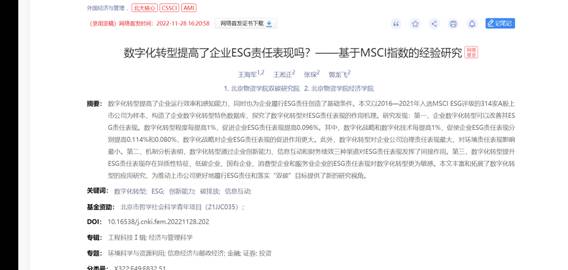 近日,伟德国际bevictor19462021级硕士研究生王淞正、张琛与金融系王海军老师、国贸系郭龙飞老师合作论文《数字化转型提高了企业ESG责任表现吗?——基于MSCI指数的经验研究》在公司管理学权威期刊《外国经济与管理》网络首发。