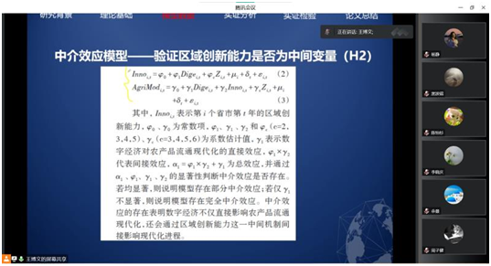 王博文同学分享了学者曾庆均等发表在《中国流通经济》2022年第8期的“数字经济、区域创新能力与农产品流通现代化”一文。文章以乡村振兴为研究背景,研究数字经济对于农产品流通现代化的作用机理。王博文同学认为:第一,文中采用了多种实证研究方法,非常值得研究生进行学习参考;第二,文章自变量的指标构建和行文存在瑕疵,需要平时写作时加以注意和避免。点评:余曼老师认为文章模型较丰富,工作量较大,属于一篇标准的采用计量手段研究经济问题的文章,希望大家在之后阅读或研究类似问题时快速联想检验方法,完善自己的研究。