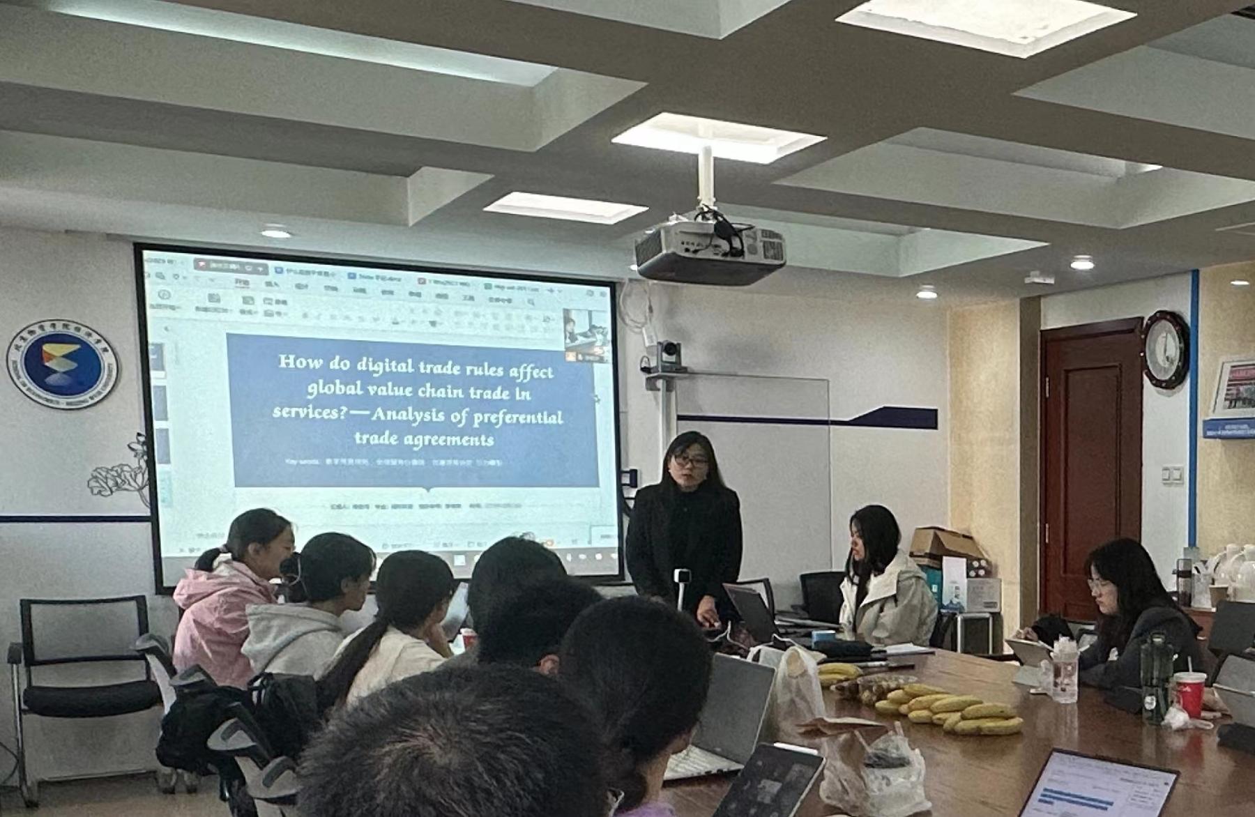 陈佳玮同学分享了吴杰等学者于2023年发表在The World Economy上的文章“How do digital trade rules affect global value chain trade in services?—Analysis of preferential trade agreements”。本文通过构建包含优惠贸易协定PTA数字贸易规则的深度和广度指标,运用引力模型对全球价值链服务贸易出口进行回归分析。实证分析表明,无论是数字贸易规则的深度还是广度,其对全球价值链服务贸易出口均有显著的促进作用,且对全球价值链前向服务出口的影响大于对全球价值链后向服务出口的影响。汇报结束后,李晓庆老师进行了点评,称赞陈佳玮同学学术能力有所进步,并表示本篇文章是为数不多的研究GVC服务贸易的参考文献,其对服务贸易的细分方式比较新颖,值得学习和借鉴。