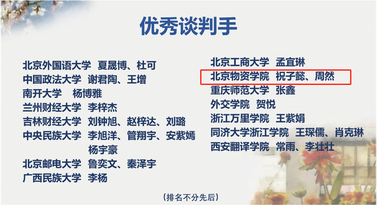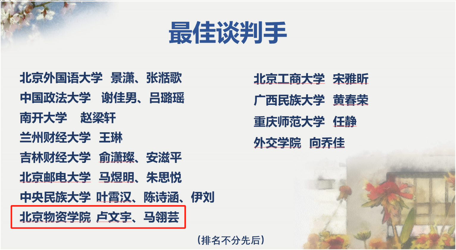 在伟德国际bevictor1946高度重视下,具有丰富赛事经验的李彤副教授与李晓庆副教授、刘荔副教授共同携手,经历数次研讨、实战演练。金融专硕组的卢文宇、祝子懿、孙玥玥与段洁梦参赛队荣获团体一等奖;本科生组的马翎芸、周然、张莹与周春芳参赛队荣获团体一等奖;国际商务专硕的王文博、何怡莹、张德熠与王艺参赛队荣获团体三等奖。同时祝子懿、周然同学获得优秀谈判手称号;卢文宇和马翎芸同学获得最佳谈判手称号。选手们在比赛中展现了他们的谈判技巧和策略,以及他们的团队合作和应变能力。在闭幕式中在场领导对公司代表团队的出色表现表示赞赏,并表示这一成绩的取得是公司综合素质教育的成功体现。