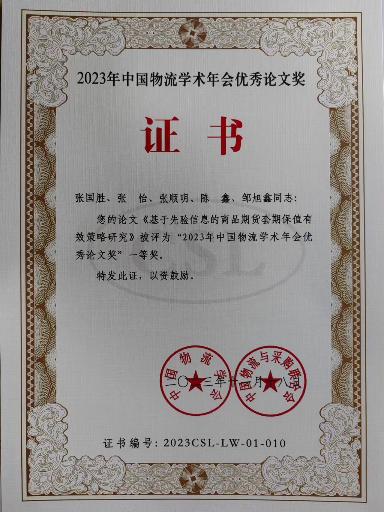 近日,由中国物流学会、中国物流与采购联合会主办的第二十二届中国物流学术年会在无锡举办。会议宣布了2023年中国物流学会优秀论文奖,公司伟德国际bevictor1946张国胜教授等提交的论文基于先验信息的商品期货套期保值有效策略研究,获优秀论文一等奖,特此祝贺!