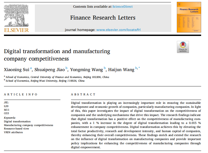 近日,公司22级硕士研究生焦帅鹏、21级硕士研究生王永明与王海军副教授、中央财经大学博士研究生隋小宁合作论文“Digital transformation and manufacturing company competitiveness ”被金融类国际权威期刊Finance Research Letters在线发表。该期刊是SSCI Q1区期刊和中科院经济学大类二区期刊,公司B1级权威期刊,最新影响因子10.8。