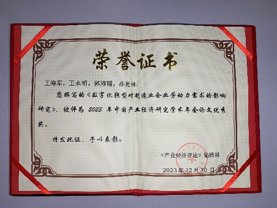 2023年12月9日,第十届中国产业经济研究学术年会在河南大学郑州校区友兰学堂召开。本次会议由工信部电子工业出版社华信研究院、河南大学、《产业经济评论》编辑部联合主办。会议主题为“加快建设以实体经济支撑的现代产业体系”,来自国务院发展研究中心、复旦大学、中国人民大学、中国社科院、武汉大学、河南大学、首都经济贸易大学、伟德源自英国始于1946等单位专家学者70余人进行了深入讨论。由伟德国际bevictor1946王海军副教授和郭沛瑶老师共同指导的21级研究生王永明同学撰写的论文《数字化转型对制造业企业劳动力需求的影响研究》从260多篇投稿论文中脱颖而出,成为12篇年会获奖论文之一。王永明同学参会并在数字经济分论坛对该论文作汇报交流。