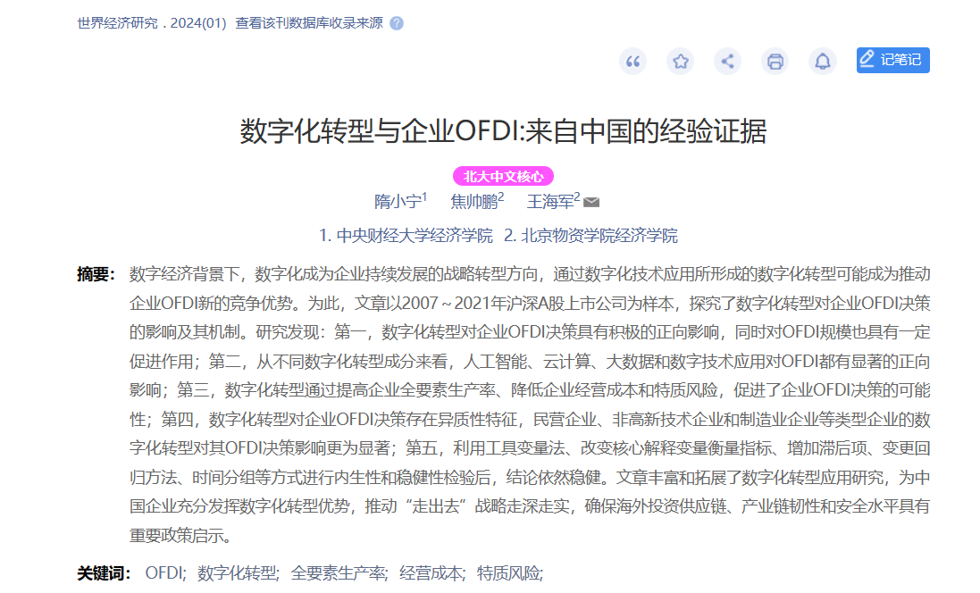 近日,伟德国际bevictor194622级硕士研究生焦帅鹏与指导老师王海军教授、中央财经大学博士研究生隋小宁合著论文《数字化转型与企业OFDI:来自中国的经验证据》刊发于经济类权威期刊《世界经济研究》2024年第1期。该刊最新影响因子为6.2。论文相关内容简介如下: