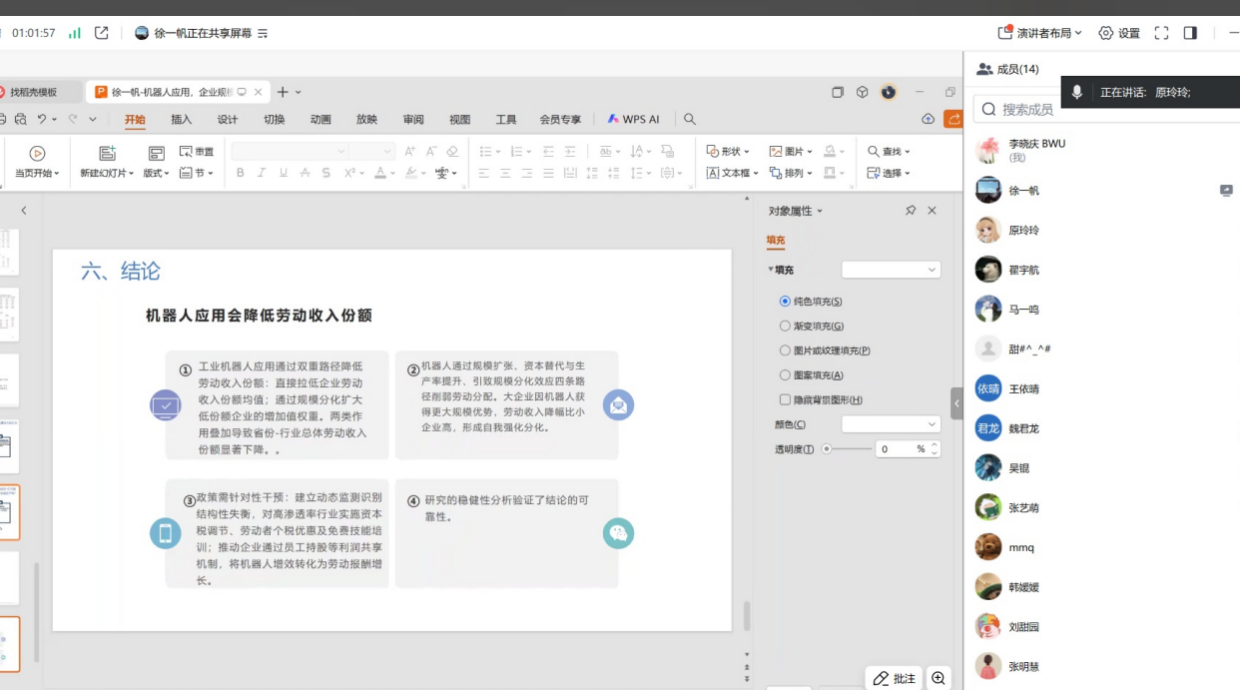 徐一帆同学分享的是易苗、刘朋春、郭白滢的《机器人应用、企业规模分化与劳动收入份额》。该文利用中国工业企业微观加总数据,基于对省份-行业层面劳动收入份额的均值-协方差分解,从企业规模分化视角考察工业机器人进口应用对劳动收入份额的影响和作用机制。研究发现,机器人应用不仅降低了平均的劳动收入份额,而且加剧了省份-行业内“企业规模越大、劳动收入份额越低”的负向结构效应,进而降低了总体加权劳动收入份额。机制分析结果表明,机器人除了通过促进资本替代劳动、提高劳动生产率、扩大规模降低劳动收入份额外,会引致规模分化效应带来劳动收入份额下降。