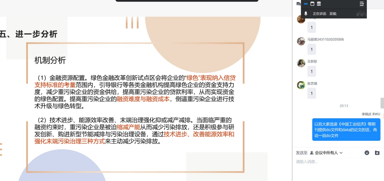 张艺萌同学分享的是崔惠玉等的《绿色金融创新、金融资源配置与企业污染减排》。文章借助2017年国务院设立绿色金融改革创新试验区这一准自然实验,利用2014-2018年全国税收调查数据,在企业层面细致考察了绿色金融改革创新政策对重污染企业污染排放行为的影响。研究发现,绿色金融改革创新试验区的设立显著抑制了试点地区内重污染企业的污染排放行为。机制分析表明,从短期看,绿色金融改革创新试验区的设立未能有效倒逼重污染企业实现技术升级,而是通过遏制重污染企业的生产经营活动,促使企业污染排放下降。异质性分析发现,绿色金融改革创新政策的污染减排效果在大企业、金融发展水平较高地区的企业中更为明显,绿色金融改革创新政策是对地方环保执法效果的有益补充。